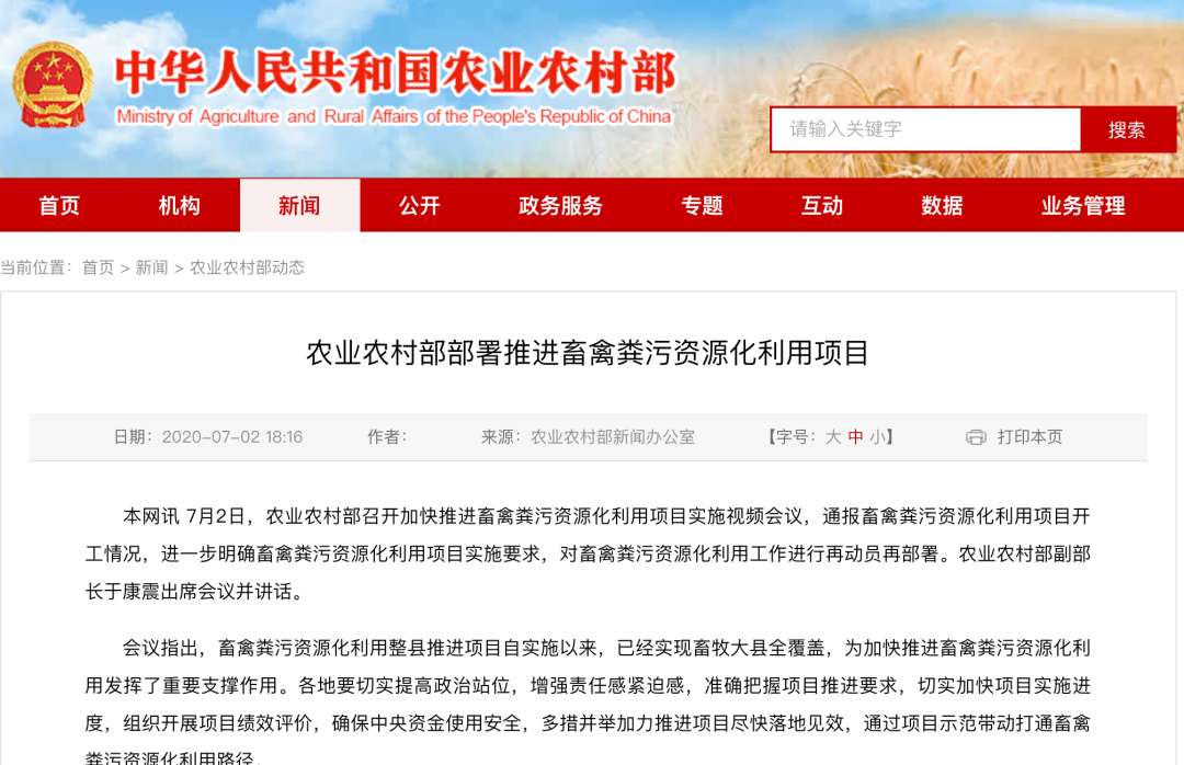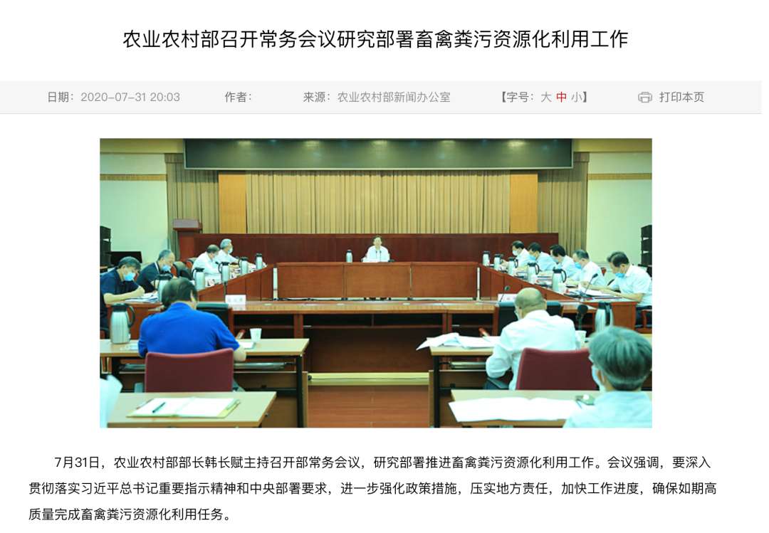 2020年6月,农业农村部、生态环境部印发《进一步明确畜禽粪污还田利用要求强化养殖污染监管的通知》,通知进一步明确畜禽粪污还田利用有关标准和要求。7月2日及7月31日,农业农村部更是两次部署畜禽粪污资源化利用工作。