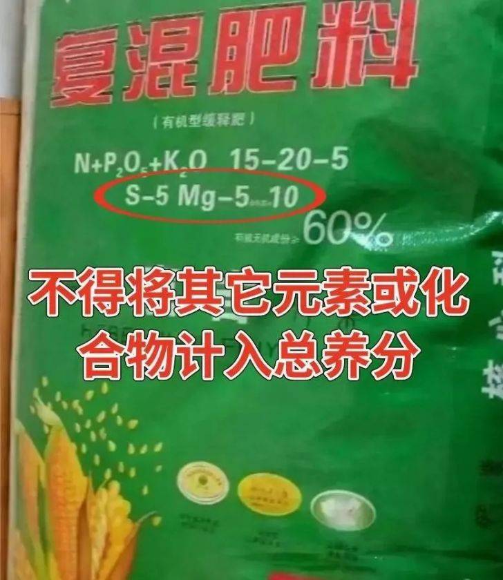 上图包装袋上,除了氮(N)、磷(P2O5)、钾(K2O),很明显把硫(S)、镁(Mg)也计入了总养分里,60%的含量看上去很多。